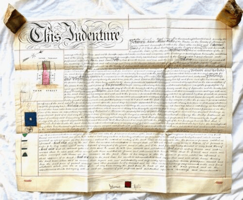 Indenture between John Allan Rolls, 1st Baron Llangattock, (1837-1912) Victorian landowner, Conservative Party politician, socialite, local benefactor and agriculturalist, and Edward Yates, successful developer noted for the construction of 2,500 houses at Walworth Road. This document, handwritten on parchment and signed on January 2, 1871, is a agreement for a 70 year lease on #15 York Street in the amount of ten pounds a month. Double-sided, signed by both party’s attorneys, with four wax seals, two 5-shilling stamps. Document is well-preserved with some darkening to fold edges and pinholes at fold intersections. Acquired from a reputable antiquarian bookseller in Southern California.